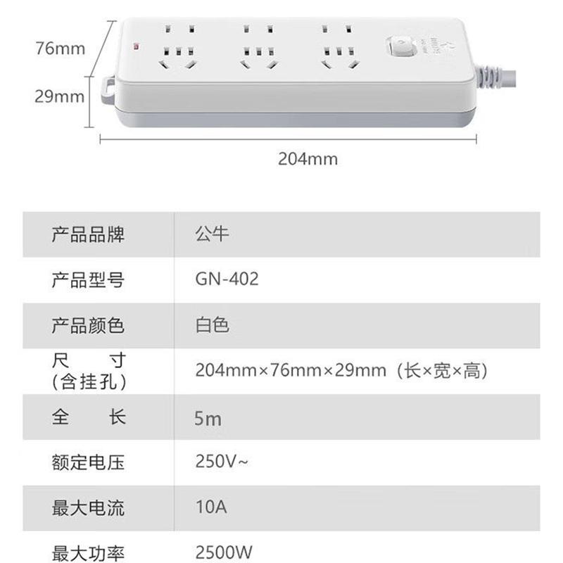 公牛GN-402总控6位插排白色5米(单位:个)(新国标)