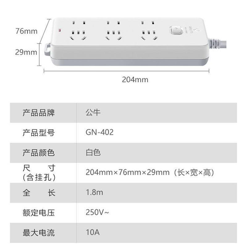 公牛GN-402总控6位插排白色1.8米(单位:个)(新国标)
